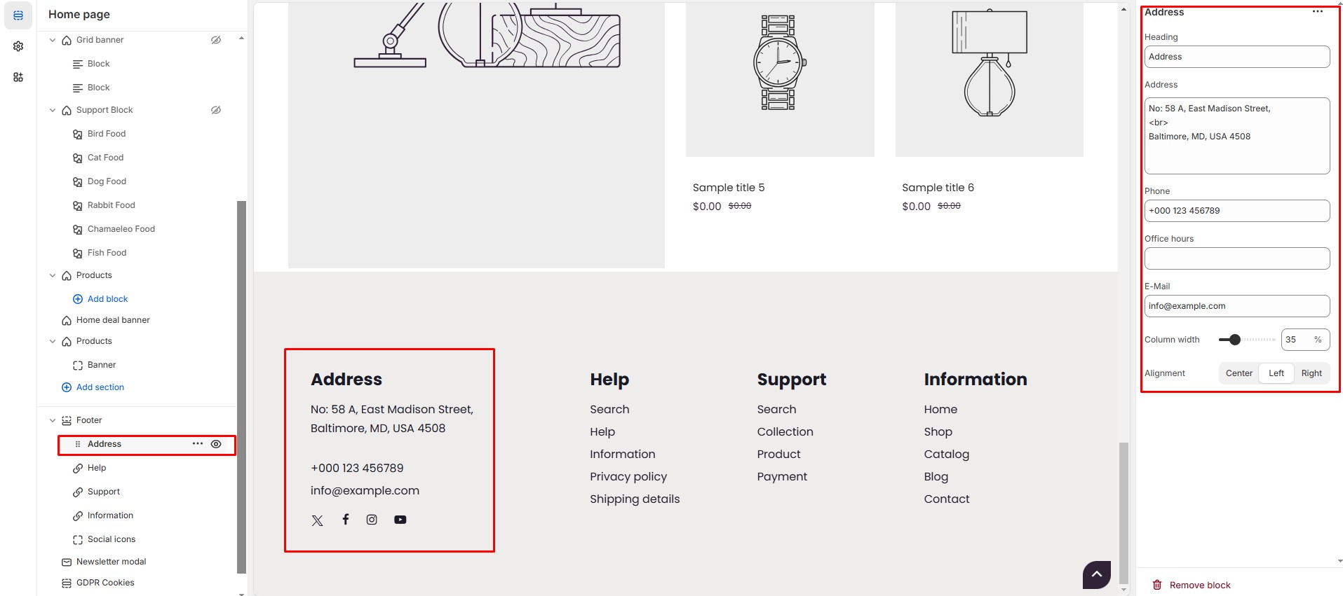 The Address Block in the Footer Section allows you to display your store’s address, phone number, email, and office hours, making it easy for customers to get in touch with you.