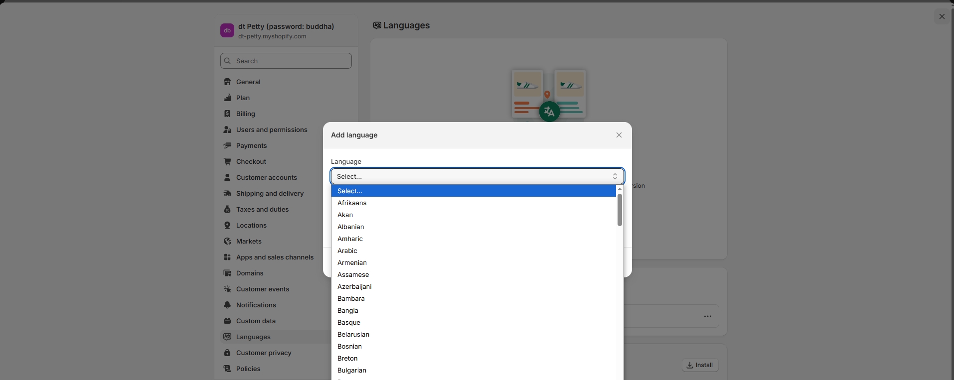 • Open Admin Store Settings > Languages > Install translate & adapt app ( Shopify Translate & Adapt).