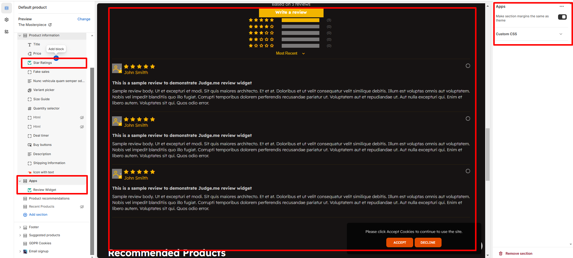 Follow the setup instructions to add the review section to your product pages (App Integration)