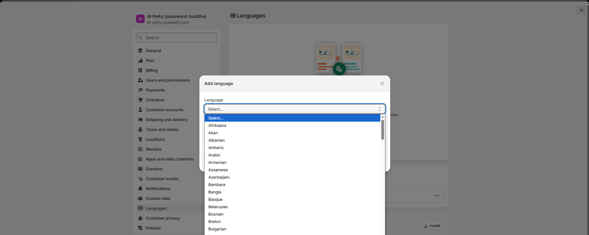 Open Admin Store Settings > Languages > Install translate & adapt app ( Shopify Translate & Adapt).