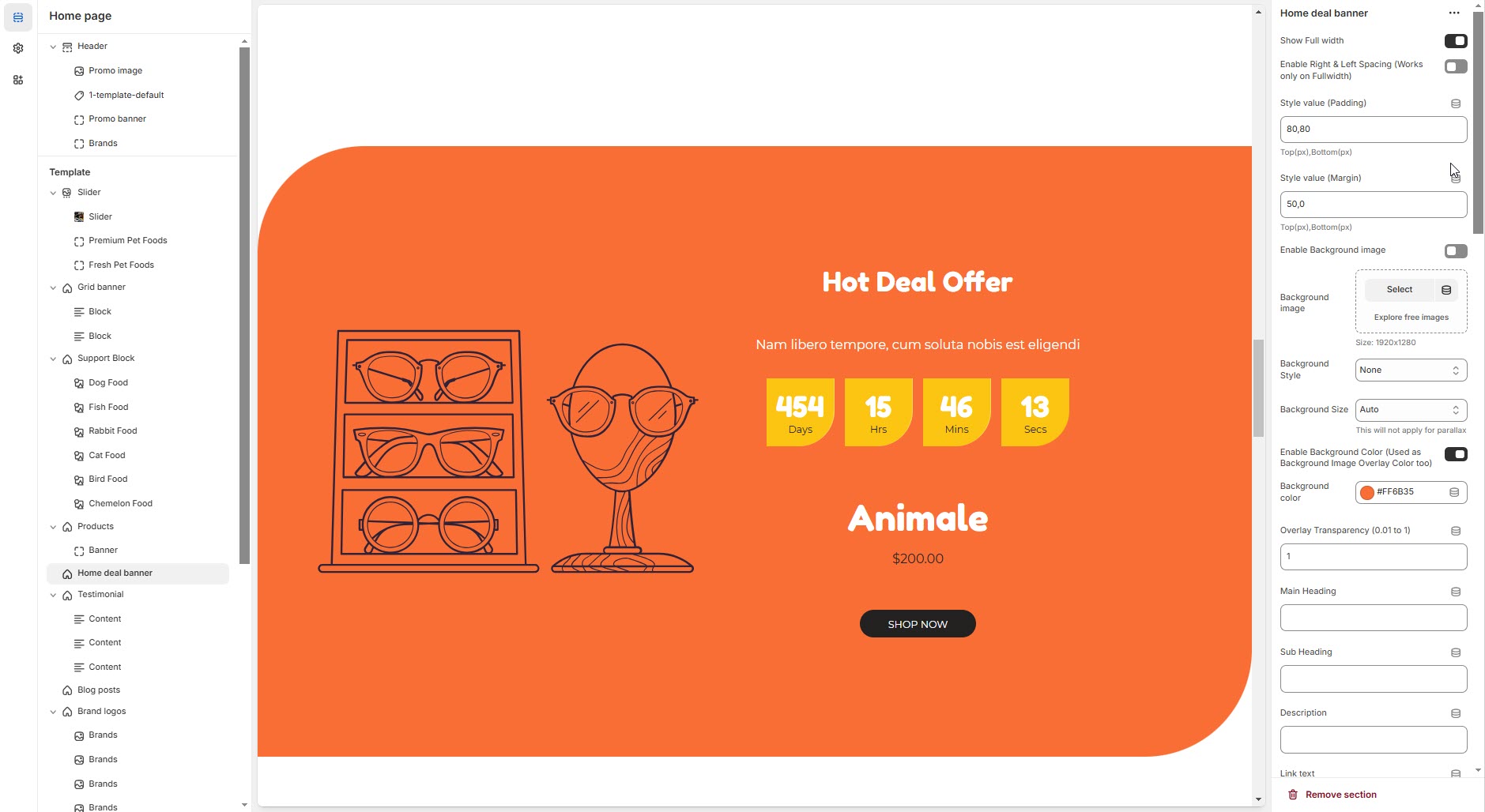 The Home Deal Banner section allows you to highlight exclusive deals with a countdown timer, promotional text, and a call-to-action button.