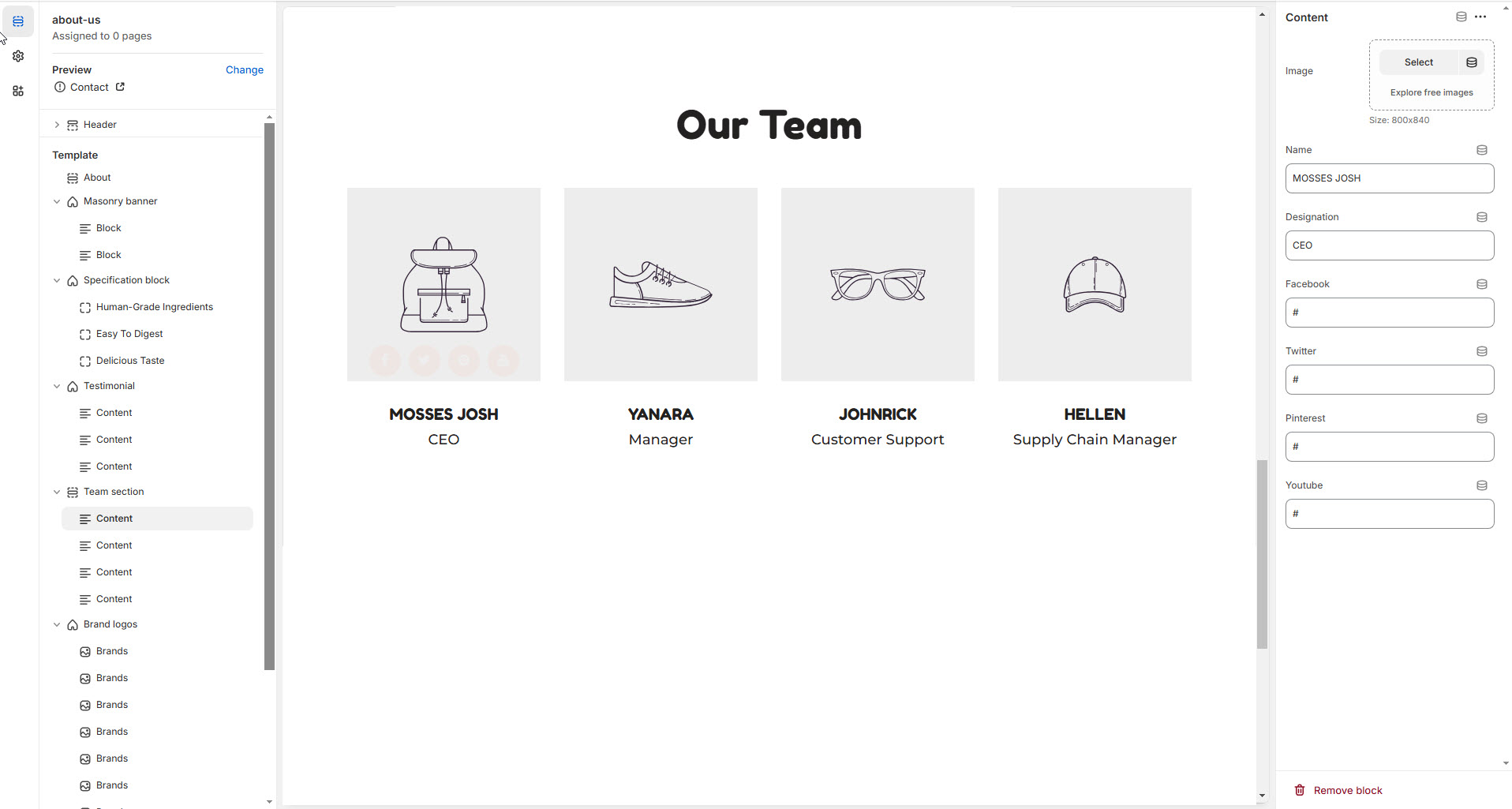 A Team Section in Shopify allows you to showcase the members of your team, adding a personal touch to your store and building trust with customers. This section typically includes photos, names, job titles, and brief bios of your team members.