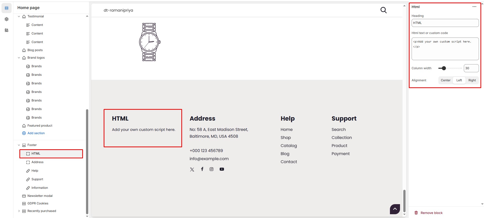 The HTML Block in the Footer Section allows you to add custom html making it ideal for sharing contact information, brand messages, or store policies.