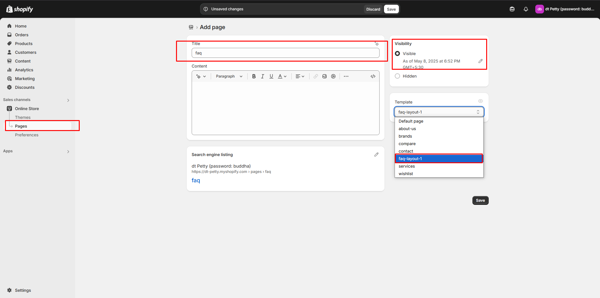Step 4: Select FAQ from the Theme template drop-down menu in the Online Store section.
