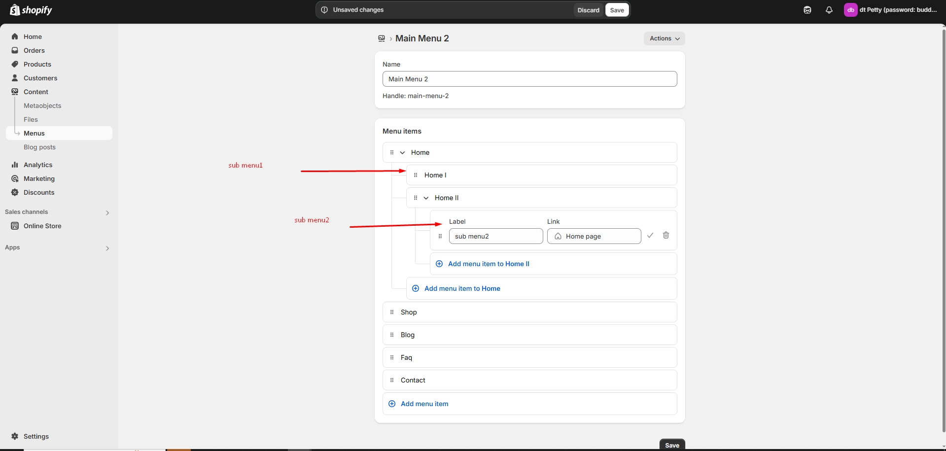 • Go to Online Store > Content > Menu in your Shopify Admin.